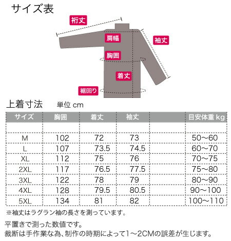 サイズ M L XL 2XL 3XL 4XL 5XL サイズスペック 胸囲 / 着丈 / 袖丈 /目安体重 ◆M (cm) :102 / 72 / 73 / 50〜60kg ◆L (cm) :107 / 73.5/ 74.5/ 60〜70kg ◆XL (cm):112 / 75 / 76 / 70〜75kg ◆2XL(cm):117 / 76.5/ 77.5/ 75〜80kg ◆3XL(cm):122 / 78 / 79 / 80〜90kg ◆4XL(cm):128 / 79.5/ 80.5/ 90〜100kg ◆5XL(cm):134 / 81 / 82 / 100〜110kg ※袖丈はラグラン袖の長さを測っています。